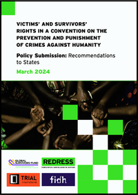 Over the last decade, the International Law Commission and the UN General Assembly have made progress in attempts to establish a Convention on Crimes Against Humanity (CAH). In this policy brief on a prospective CAH Convention, REDRESS, the International Federation for Human rights (FIDH), Global Survivors Fund (GSF) and TRIAL International voice support for a prospective CAH convention. This Convention can cement Customary International Law and fill an important existing gap in treaty law regarding crimes against humanity. The policy brief makes recommendations to States on reflecting progressive provisions on victims’ and survivors’ rights in a prospective CAH Convention